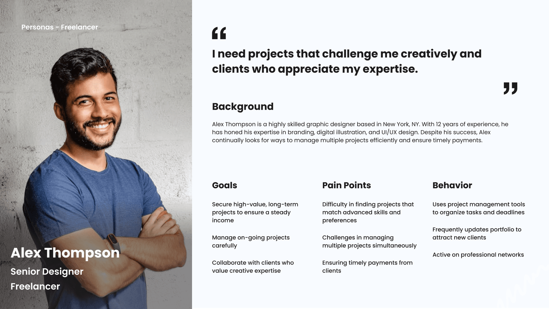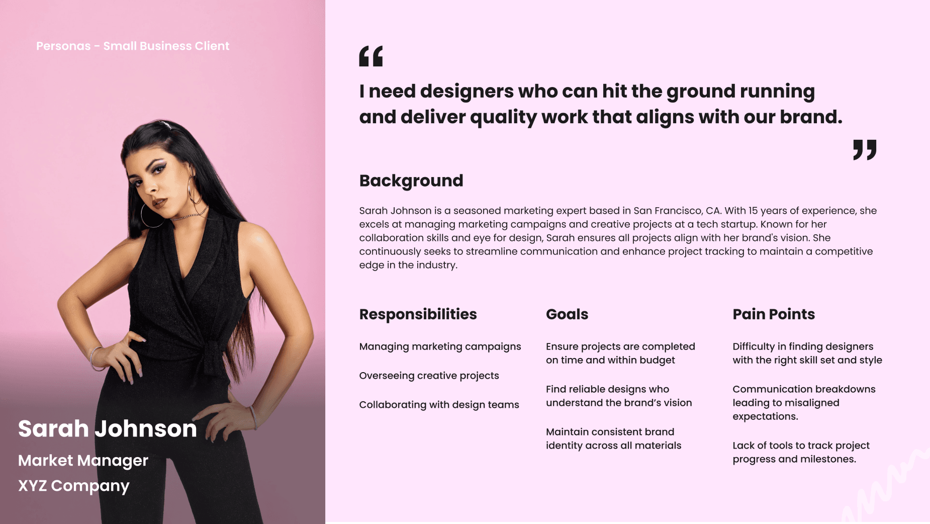Create user personas from provided data for both freelance graphic designers and small business clients. Base your design decisions on these personas.