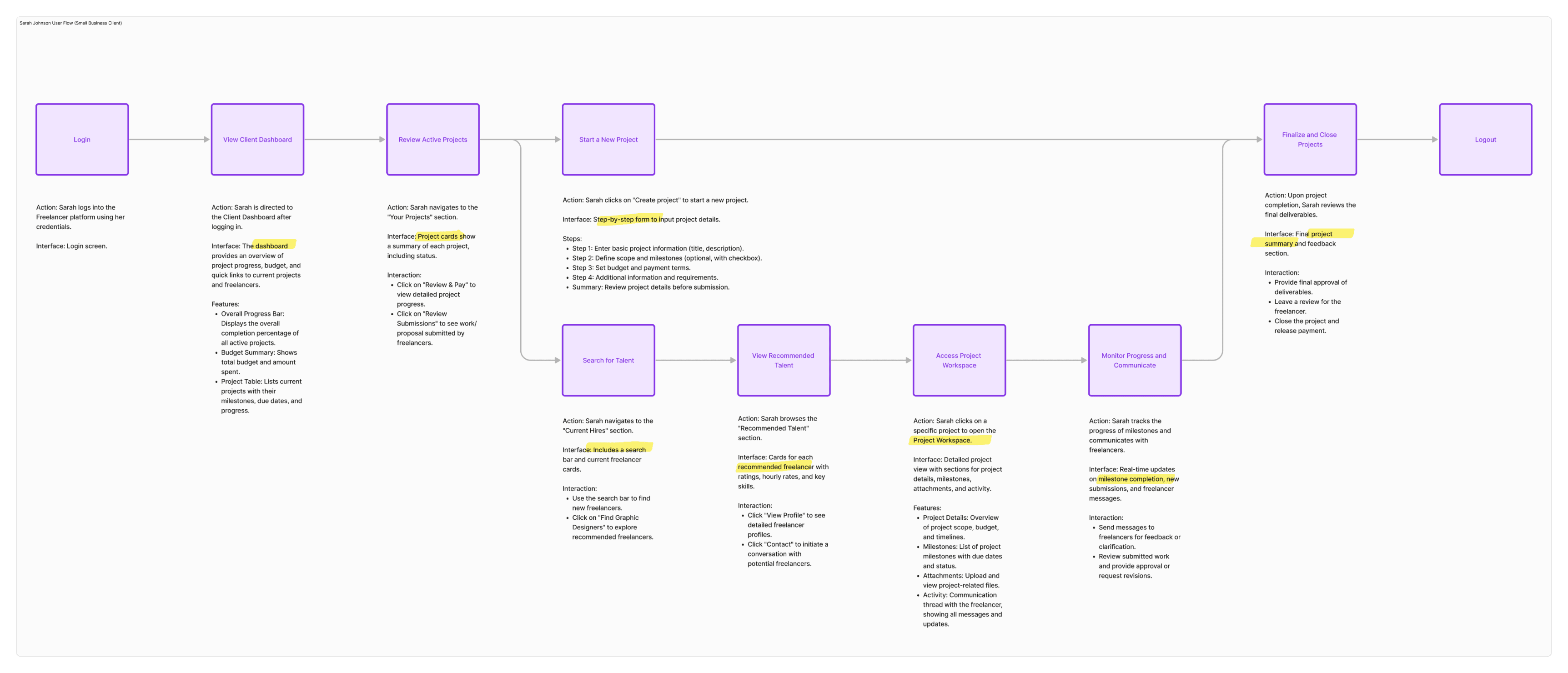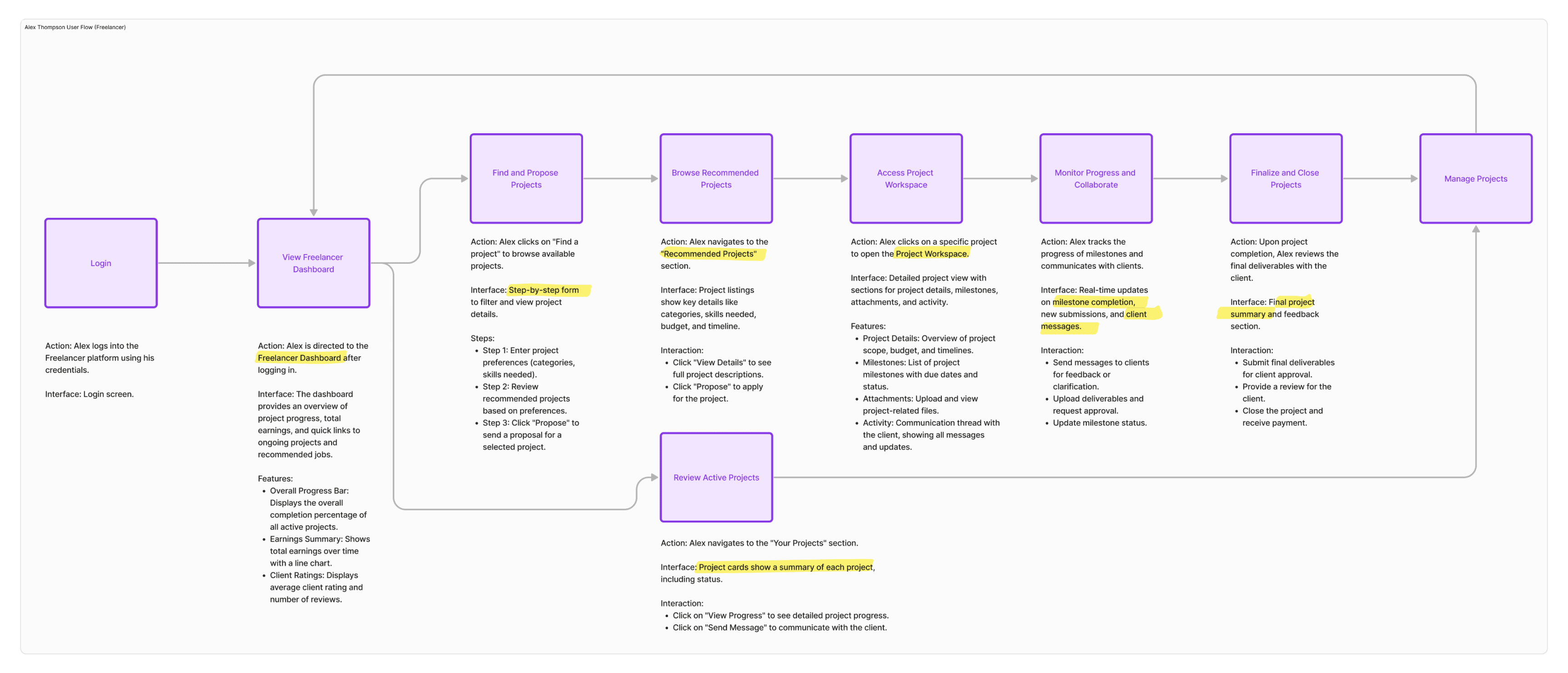 The goal is to design a feature for this digital marketplace that enhances the interaction between freelance graphic designers and small business clients. The platform currently facilitates basic search, communication, and payment functionalities. The task is to design a feature that improves the matchmaking and project collaboration experience. The requirements were to propose a feature that helps both freelancers and businesses to: