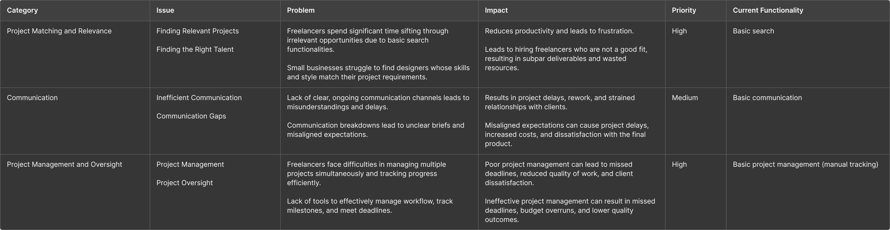 This step involves clarifying the problem and connecting it to the company’s mission and vision to ensure alignment with broader business goals. In this context, I'm developing a feature for a platform that improves the matchmaking and project collaboration experience. The primary users are small business clients and freelance graphic designers. For small business clients, the platform addresses challenges such as difficulty finding skilled freelancers, communication issues, and the lack of project management tools. For freelance graphic designers, it tackles the time-consuming nature of project searches, the complexities of managing multiple projects, and ensuring timely payments.