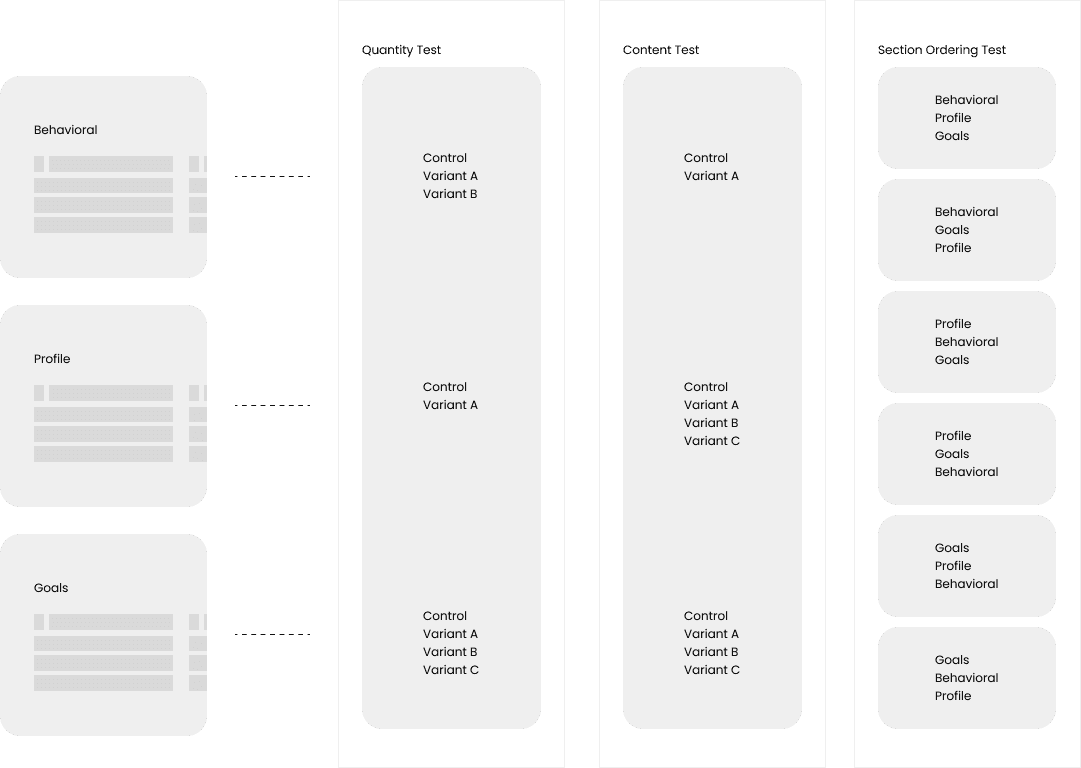 Once the components for the features were designed, I proposed conducting multi-variable testing to optimize the user experience and reduce drop-off rates. Specifically, I aimed to test three variables: the quantity of questions in each section, the content copies for engagement, and the specific ordering of the sections.